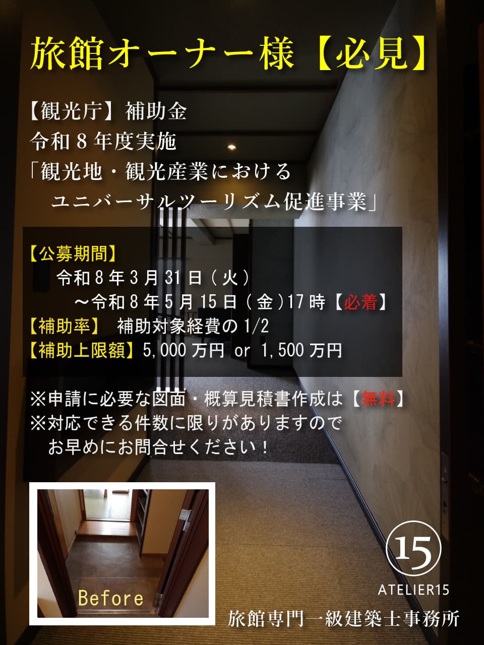 限られた予算でも、改善効果の高いポイントを見極めることで、宿の魅力は十分に高められます。小規模な改修のご相談にも対応しています。